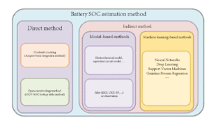 SOC refers to the commonly termed remaining capacity. Its estimation methods primarily include direct and indirect approaches, as detailed in the diagram below: